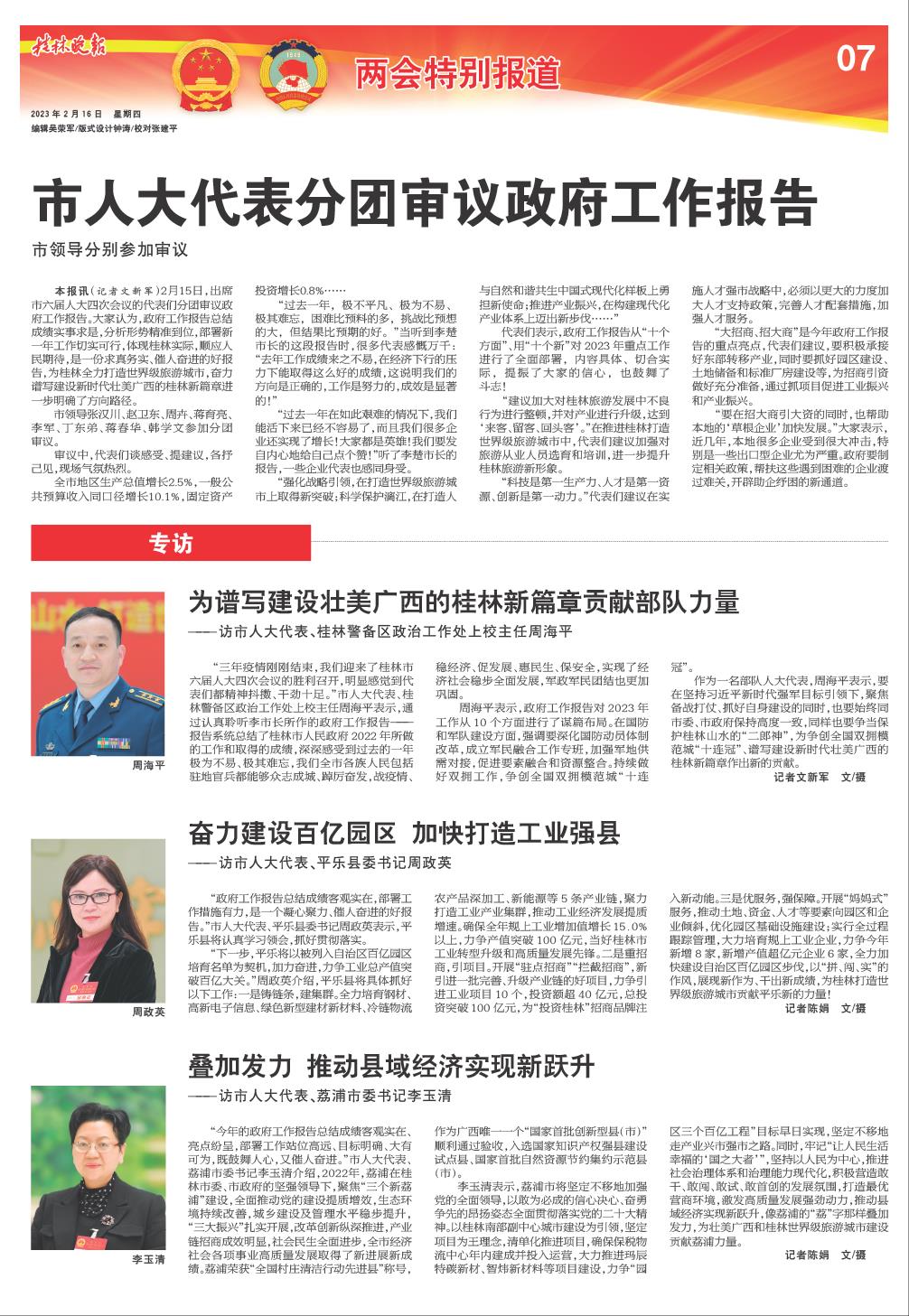 “三年疫情刚刚结束,我们迎来了桂林市六届人大四次会议的胜利召开,明显感觉到代表们都精神抖擞、干劲十足。”市人大代表、桂林警备区政治工作处上校主任周海平表示,通过认真聆听李市长所作的政府工作报告——报告系统总结了桂林市人民政府2022年所做的工作和取得的成绩,深深感受到过去的一年极为不易、极其难忘,我们全市各族人民包括驻地官兵都能够众志成城、踔厉奋发,战疫情、稳经济、促发展、惠民生、保安全,实现了经济社会稳步全面发展,军政军民团结也更加巩固。