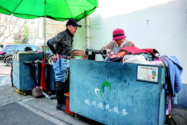 2月21日,在杭州市西湖区北山街道便民服务摊位,裁缝师陆卫芝(右)为社区居民修补衣物。