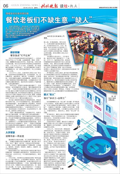 从春节假期至今,桂林迎来了久违的消费热潮,各景区景点和商业街区游人如织,各大酒楼、饭店的生意也十分不错。假期过后,随着人们陆续返岗复工,餐饮行业的复苏势头不减,不少餐厅酒楼也开始招工,增加人手,满足市民和游客的消费需求,很多餐饮老板最头痛的事情不是生意不佳,而是缺人。