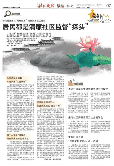 用“小腐”案例做警示,扎牢“拒腐篱笆”;社区工作人员带头担当“清廉员”,监督社区清廉工作;发动志愿者、社区学生、居民,多方互动开展廉洁教育……在叠彩区北门街道清风社区,每位居民、每个社区工作人员都担当起了清廉社区建设的一线“探头”,用点滴力量汇聚成防腐的牢固城墙,探索构建出“党建+网格+志愿服务”的清廉社区建设“清风模式”。