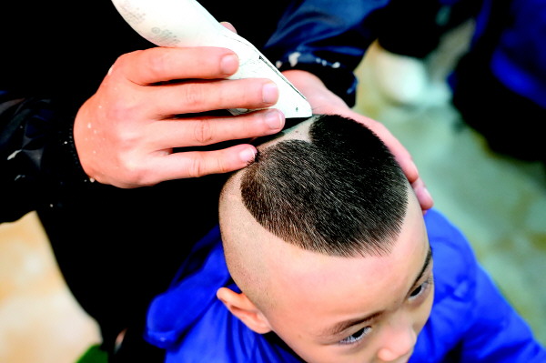 市内一家理发店,家长带着小朋友来“剃龙头”。