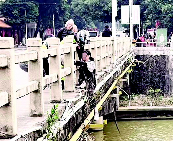 果不其然,女孩已将挎包扔进河里,双脚往外探,正准备跳下去。说时迟那时快,就在这千钧一发之际,蓝常明刚好跑到桥中央抓住了女孩的手。随后,女摩友刘小梅和唐文凤也迅速到场协助,还有摩友帮报了警。