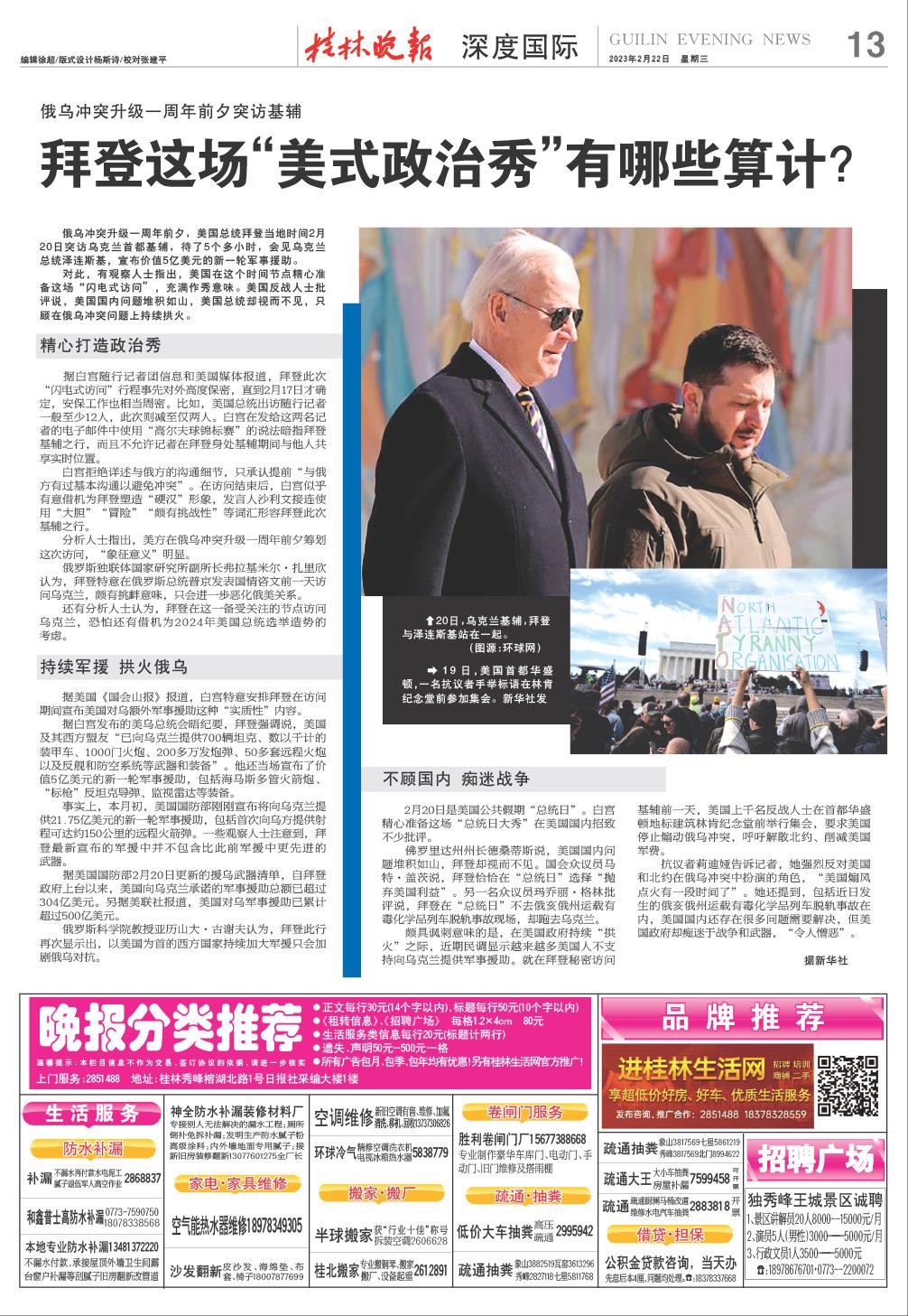 对此,有观察人士指出,美国在这个时间节点精心准备这场“闪电式访问”,充满作秀意味。美国反战人士批评说,美国国内问题堆积如山,美国总统却视而不见,只顾在俄乌冲突问题上持续拱火。