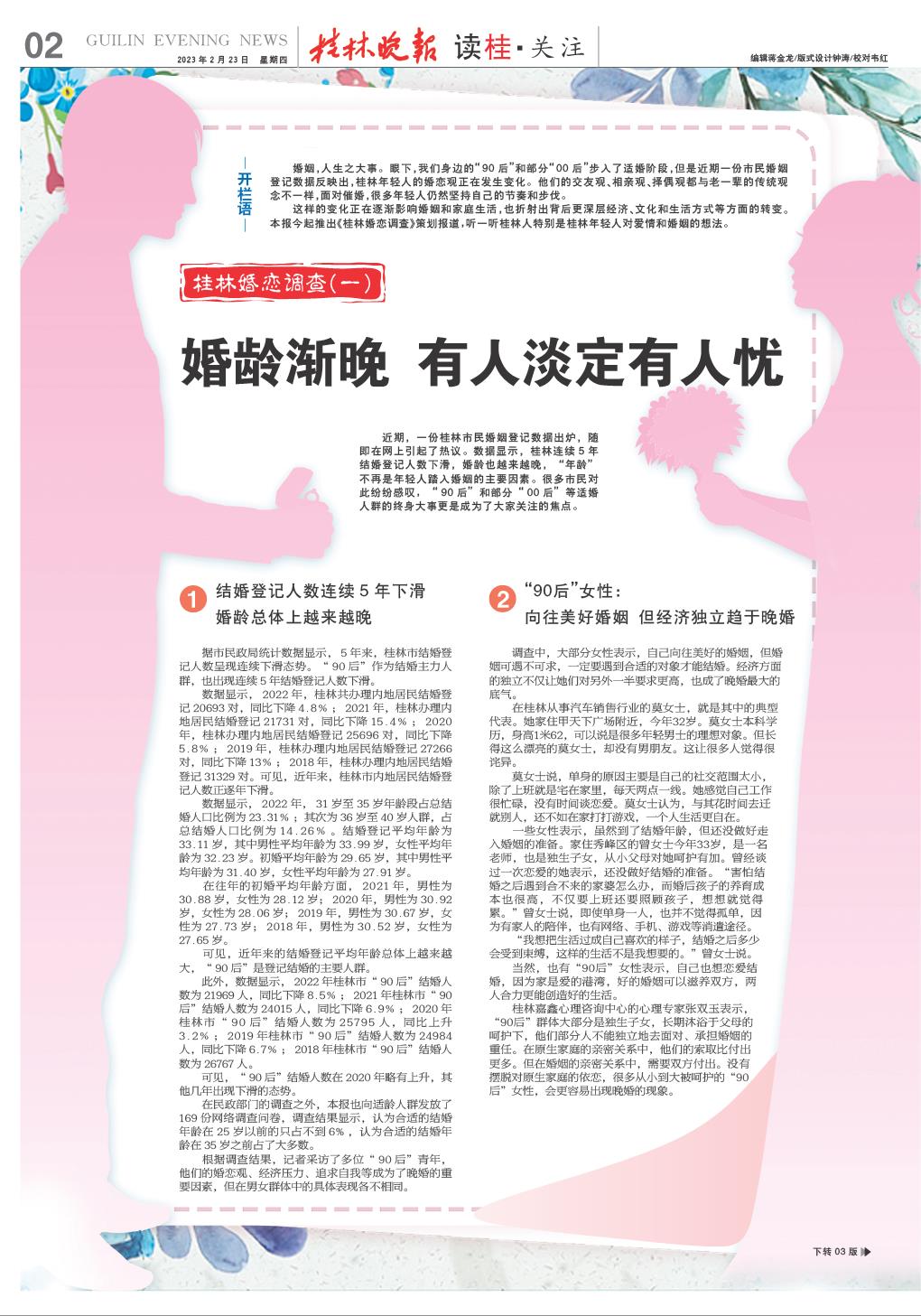这样的变化正在逐渐影响婚姻和家庭生活,也折射出背后更深层经济、文化和生活方式等方面的转变。本报今起推出《桂林婚恋调查》策划报道,听一听桂林人特别是桂林年轻人对爱情和婚姻的想法。