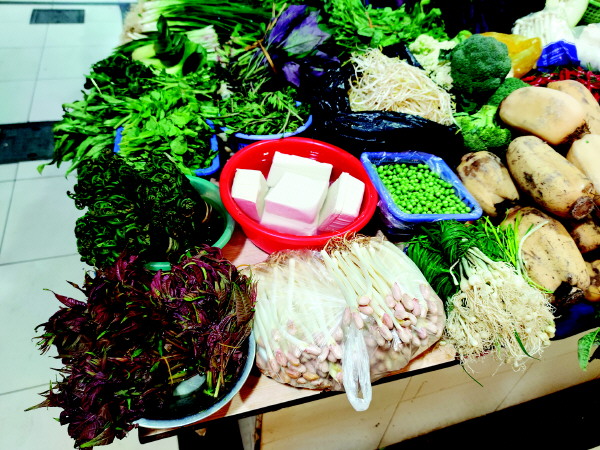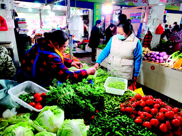 在家乐市场,有蔬菜摊位摆放着椿芽、蕨菜等新鲜春菜。