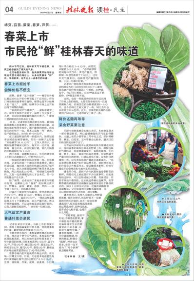 市农业科学研究中心蔬菜研究所专家潘老师表示,桂林春季的确有比较多的野菜上市。根据桂林的气候特点,目前普通蔬菜中,本地的莴笋、大白菜、萝卜、菜心、菜花已经临近尾季,但依然属于产量比较大的时候,口感品质也不错。过些时日再暖和一些,这几类本地菜产量就会逐渐减少。“其实春季桂林本地产的叶菜品种不多,到时候市场上的叶菜会以外地菜为主,受运输成本影响,价格可能也不会像现在的本地叶菜那么便宜。”