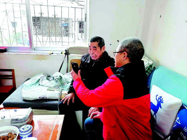 社区工作人员到生病老人秦师傅家,帮他进行退休资格认证。社区供图