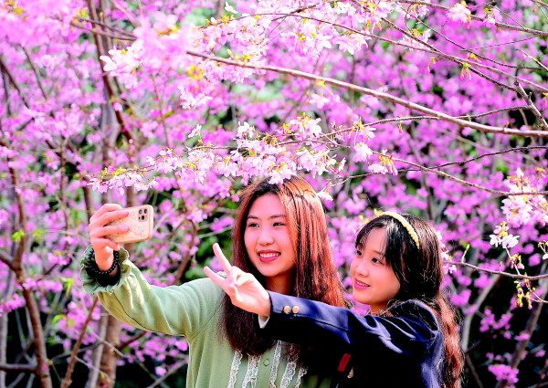 南溪山公园内的早樱盛开,引来市民游客赏花。记者李凯 摄