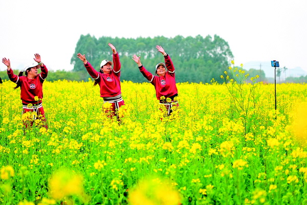 位于雁山区柘木镇大村万福路旁的百亩油菜花盛开,游客们徜徉在花海中,感受春天的气息。 记者李凯 摄