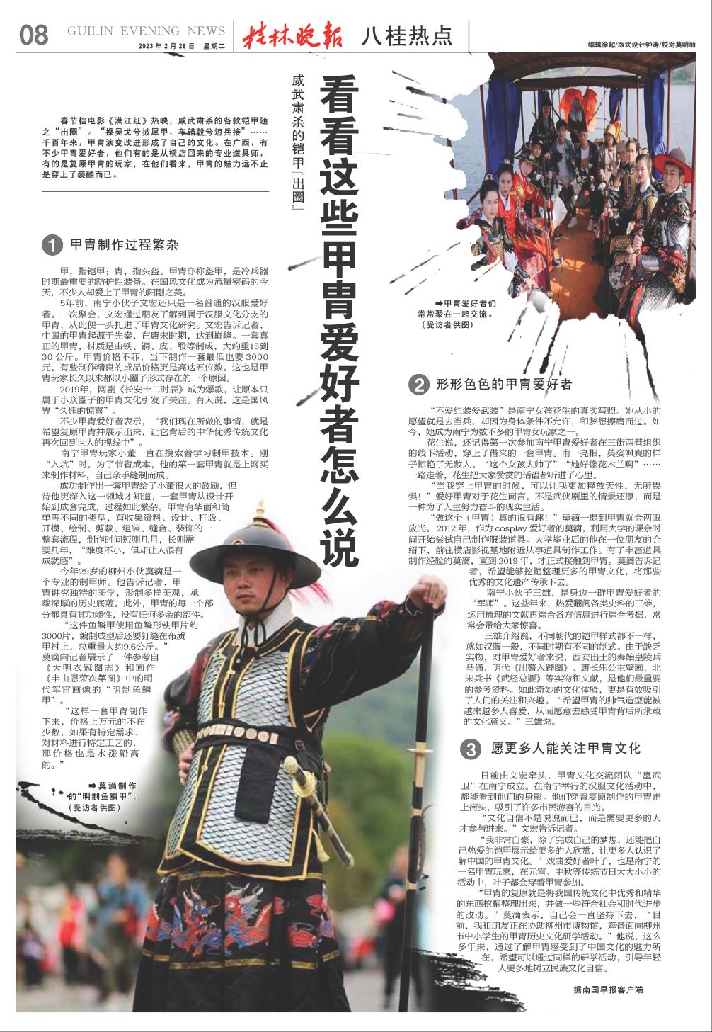 “我非常自豪,除了完成自己的梦想,还能把自己热爱的铠甲展示给更多的人欣赏,让更多人认识了解中国的甲胄文化。”戏曲爱好者叶子,也是南宁的一名甲胄玩家,在元宵、中秋等传统节日大大小小的活动中,叶子都会穿着甲胄参加。