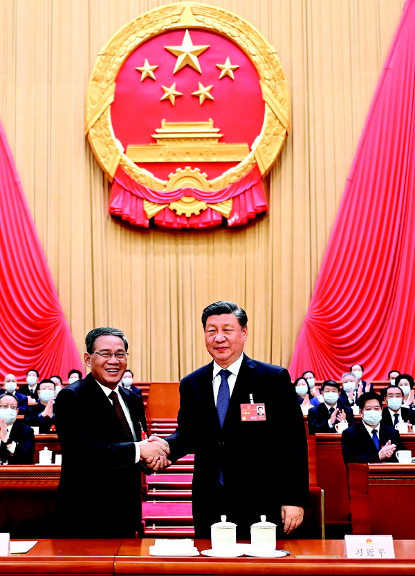 3月11日,十四届全国人大一次会议在北京人民大会堂举行第四次全体会议,根据国家主席习近平的提名,经过投票表决,决定李强为中华人民共和国国务院总理。这是习近平同李强握手。 新华社记者李学仁 摄