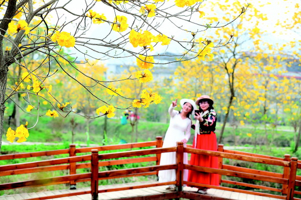 这几天,临桂区会仙镇岭上村的黄花风铃木进入盛花期,慕名而来的游客络绎不绝。图为游客昨天在春光中赏花拍照。记者李凯 摄