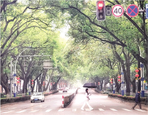 春日街头,步步皆风景。20日中午,市民走在漓江路与施家园路口的人行横道上,周围的树木绿意盎然,宛如一幅画卷,让人赏心悦目。记者滕嘉 摄