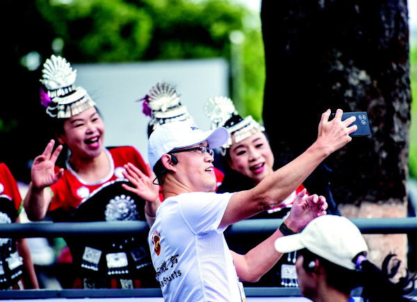 选手和身穿少数民族服装的志愿者合影,记录参赛的精彩瞬间。记者滕嘉 摄