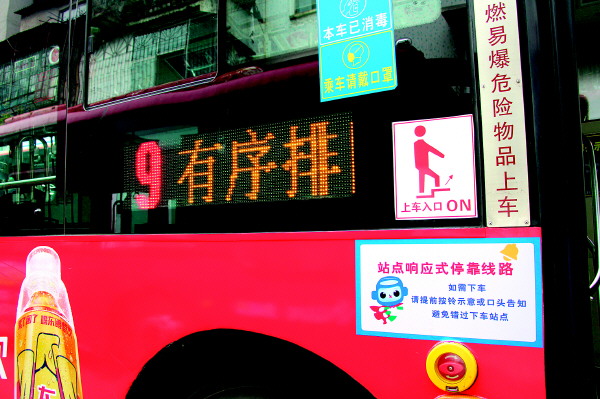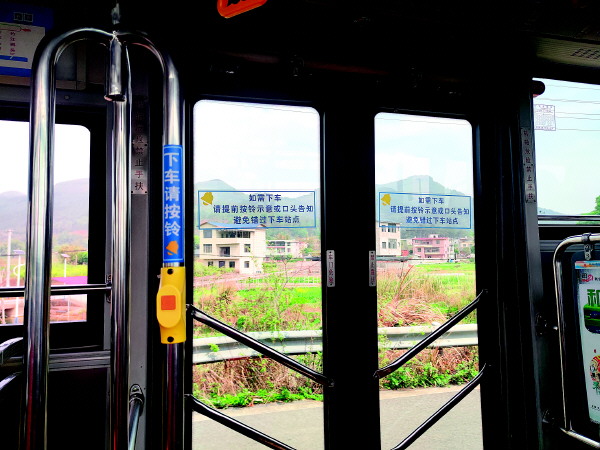 9路车的下车门附近的扶手处有了“下车请按铃”字样,车门上也有相关提示。