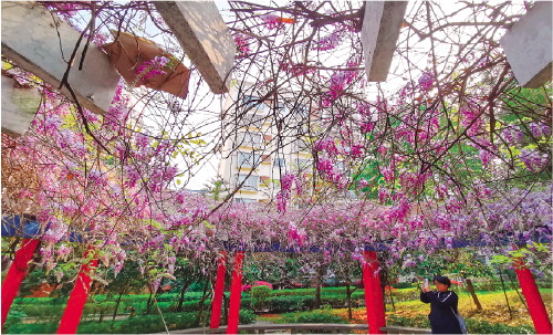 近日,施家园旁的一小区内的紫藤开得正艳,紫色的花穗就像一串串的风铃挂满藤蔓,给桂林的春天带来紫色的浪漫。 记者李凯 摄