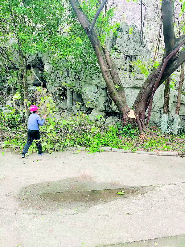该负责人介绍,西山公园正在进行的工程,需要货车从侧面运送淤泥出去和搬运材料进来,为了通行,施工队图方便,擅自砍掉了其中一棵宫粉紫荆,旁边的榕树,也是因为同样的原因被进行了修枝。