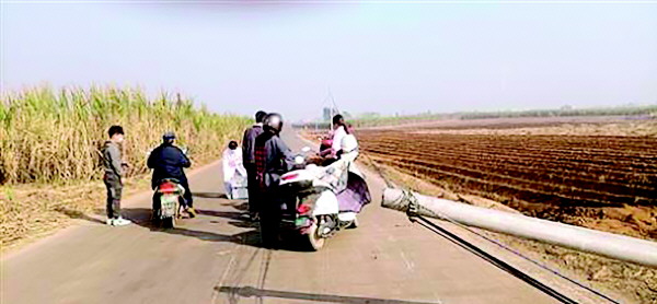 今年1月7日上午9时许,杨女士骑电动自行车搭乘一名女同事到公司上班,当行驶至蒙村镇白沙大队苗圃场旁的065乡道时,路边一根电线杆突然倒下,电线勒住杨女士的脖子致其昏迷。女同事也被砸昏,电动车被砸坏。