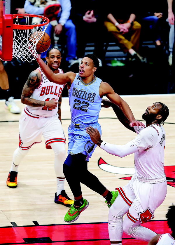 4月2日,灰熊队球员贝恩(中)在比赛中运球上篮。新华社发