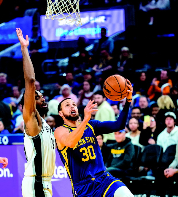3月31日,勇士队球员库里(右)在比赛中上篮。 新华社发