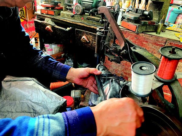 还有几位顾客拿了鞋子来修,李师傅根据鞋子的做工和材质来确定需要用针线缝还是用胶水粘。其中一位顾客想让李师傅帮她用针线缝合脱胶的鞋,但她拿来的鞋子是用胶水粘的鞋底,李师傅告诉她用针线缝没有那么美观,建议还是用胶水粘。李师傅告诉记者,虽然用针线缝他可以多赚两块钱,但他要站在顾客的角度为他们考虑问题。