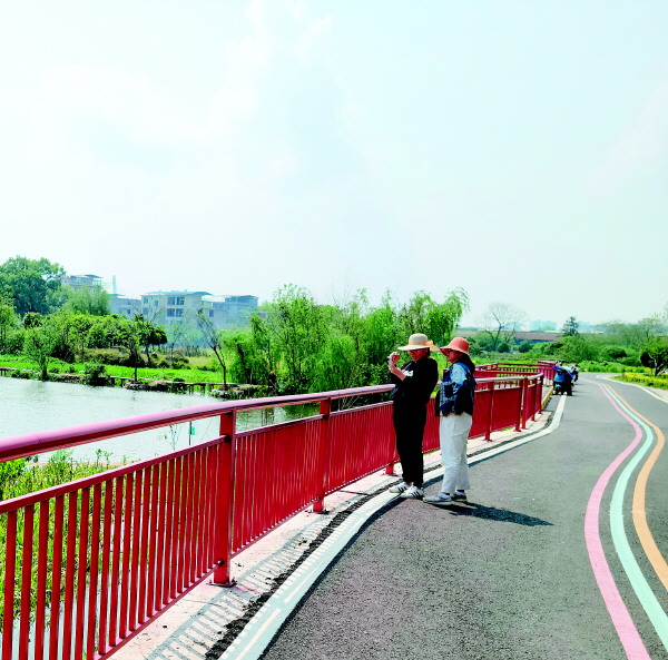 近日,市民胡女士与朋友相约前往“彩虹步道”拍照,漫步其间,感受山清水秀。“这里的环境真的很好,太适合拍照了,不论什么搭配都很出片。”在池塘边,胡女士和朋友欣赏着手机上刚拍好的照片,仿佛意犹未尽。池塘周围有一些市民坐在树荫下垂钓,除此之外,“彩虹步道”沿途还有许多种植园和原生态的农田,走过入口附近的一片树林之后,放眼望去豁然开朗,呈现出一片绿色的海洋,一派生机勃勃的景象。