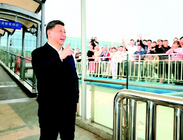 4月10日至13日,中共中央总书记、国家主席、中央军委主席习近平在广东考察。这是10日下午,习近平在湛江市徐闻县徐闻港泊位码头,同船上的旅客亲切交流。新华社记者鞠鹏 摄