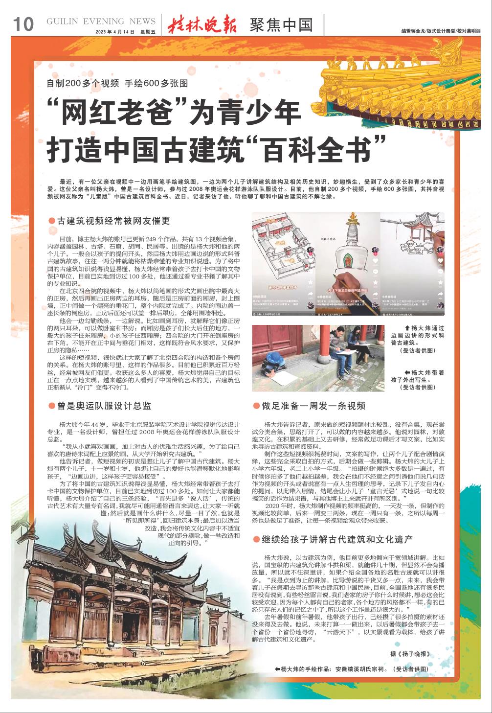 最近,有一位父亲在视频中一边用画笔手绘建筑图,一边为两个儿子讲解建筑结构及相关历史知识,妙趣横生,受到了众多家长和青少年的喜爱。这位父亲名叫杨大炜,曾是一名设计师,参与过2008年奥运会花样游泳队队服设计。目前,他自制200多个视频,手绘600多张图,其抖音视频被网友称为“儿童版”中国古建筑百科全书。近日,记者采访了他,听他聊了聊和中国古建筑的不解之缘。