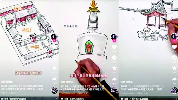 目前,博主杨大炜的账号已更新249个作品,共有13个视频合集,内容涵盖园林、古塔、石窟、胡同、民居等。出镜的是杨大炜和他的两个儿子,一般会以孩子的提问开头,然后杨大炜用边画边说的形式科普古建筑故事,往往一两分钟就能将枯燥难懂的专业知识说透。为了将中国的古建筑知识说得浅显易懂,杨大炜经常带着孩子去打卡中国的文物保护单位,目前已实地到访过100多处,他还通过看专业书籍了解其中的专业知识。