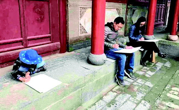 杨大炜带着孩子外出写生。(受访者供图)