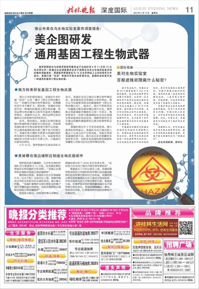 俄罗斯国家杜马和俄罗斯联邦委员会于当地时间4月11日和12日先后审议并一致通过议会调查委员会关于美国在乌克兰生物实验室活动的最终调查报告。根据俄罗斯国家杜马12日在其网站上公布的报告文件显示,美国打着“反恐”等旗号开展生物军事活动,美国的目标是开发一种通用的基因工程生物武器。