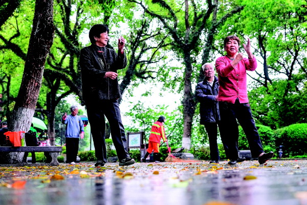 近日,天虽然下着毛毛雨,但一些市民一大早就来到榕湖畔,坚持在这里锻炼身体,保证良好的运动习惯。 记者滕嘉 摄