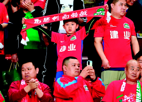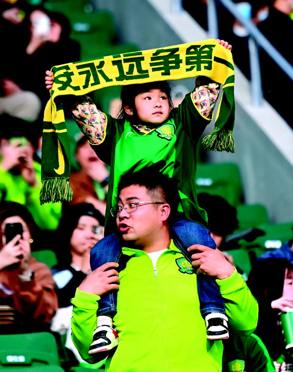 4月15日,一名北京国安队小球迷(上)在比赛前为球队加油助威。新华社发