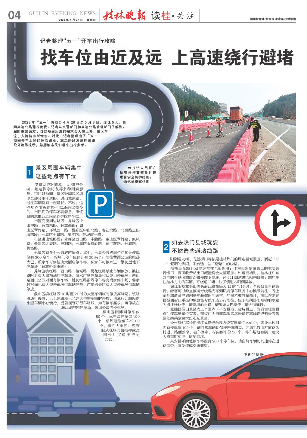 2023年“五一”假期自4月29日至5月3日,连休5天,期间高速公路通行免费。记者从交警部门和高速公路管理部门了解到,届时探亲访友、自驾短途出游的需求会大幅上升,市区车流、人流将有所增加。对此,记者整理出了“五一”期间开车上路的危险路段、施工路段及易拥堵路段分流等提示,希望给市民们带来出行参考。