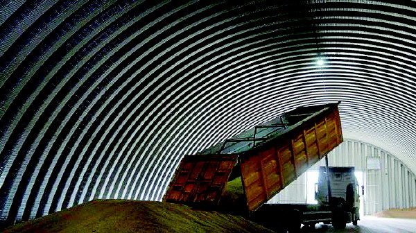 货车在一座乌克兰粮仓中卸载谷物。(资料图片)