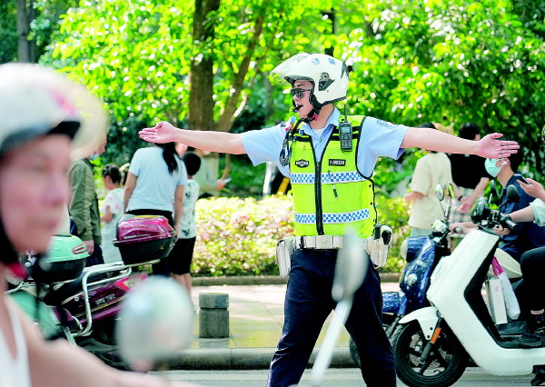 1日,在滨江路的车流中,象山交警温吉祥在忙着疏导交通。