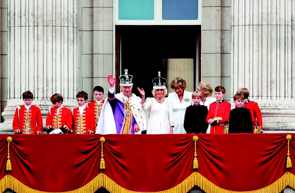 6日,在英国伦敦,英国国王查尔斯三世和王后卡米拉加冕后在白金汉宫阳台向民众挥手致意。新华社发