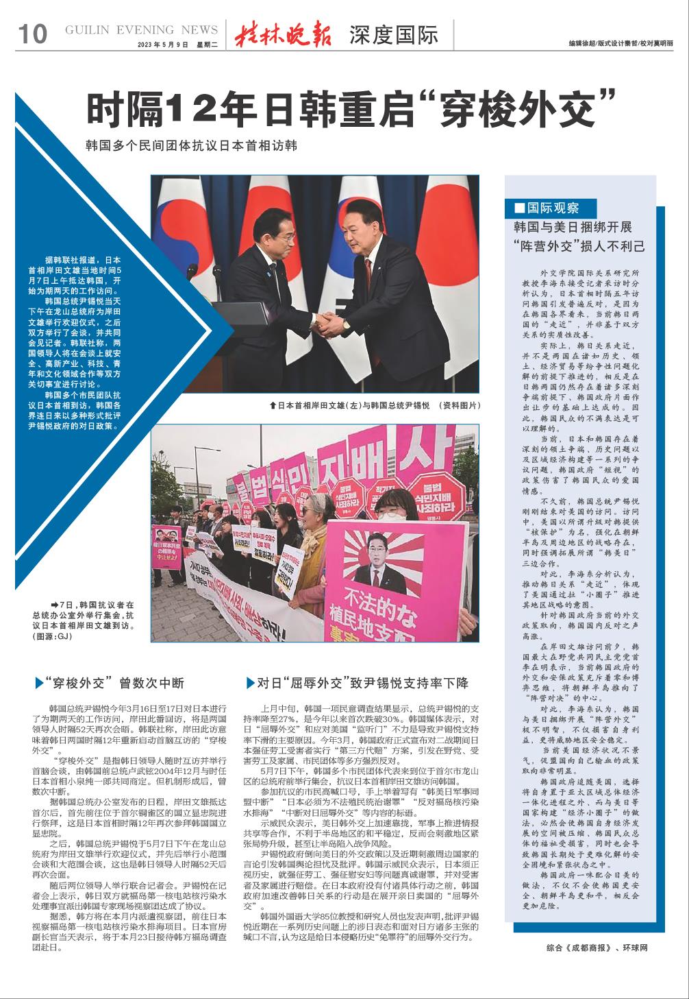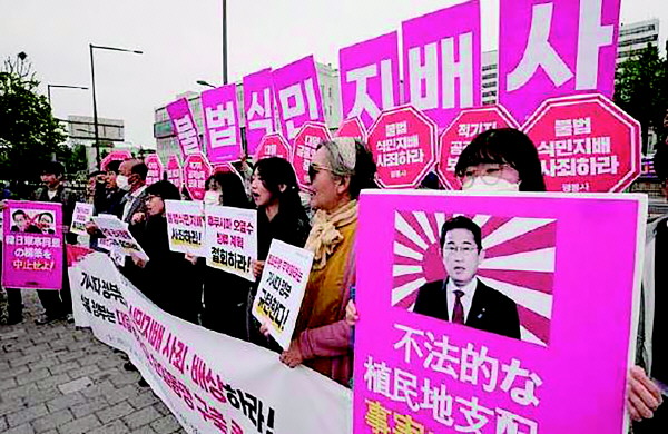 尹锡悦政府倒向美日的外交政策以及近期刺激周边国家的言论引发韩国舆论担忧及批评。韩国示威民众表示,日本须正视历史,就强征劳工、强征慰安妇等问题真诚谢罪,并对受害者及家属进行赔偿。在日本政府没有付诸具体行动之前,韩国政府加速改善韩日关系的行动是在展开亲日卖国的“屈辱外交”。
