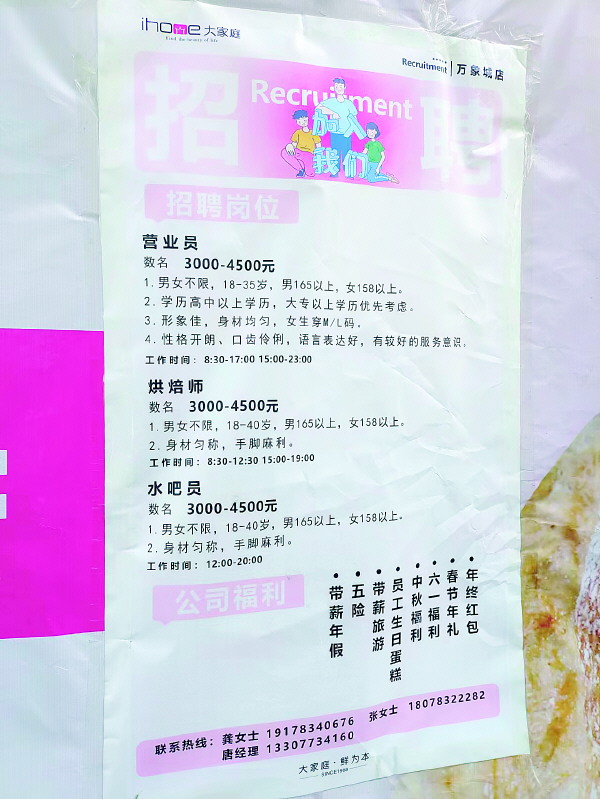 了解到小霞的情况后,记者随后来到大家庭万象城门店,门店目前还在装修中,外侧有大片围挡,招聘广告就张贴在围挡上。招聘广告写明招聘岗位有营业员、烘焙师和水吧员。在营业员的招聘条件中具体写着“1.男女不限,18-35岁,男165以上,女158以上。2.学历高中以上学历,大专以上学历优先考虑。3.形象佳,身材均匀,女生穿M/L码……”