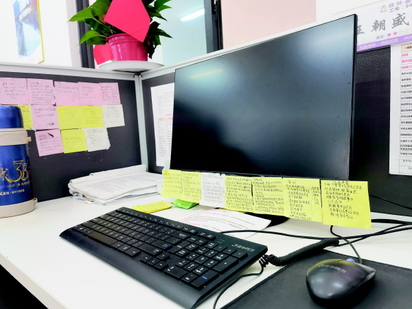 一名员工的工位上贴满了自己的学习笔记。记者阳聃甫 摄