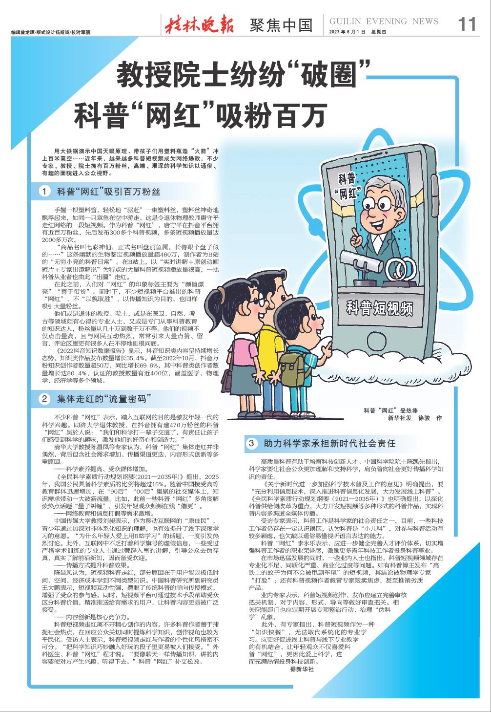 此外,有专家指出,科普短视频作为一种“知识快餐”,无法取代系统化的专业学习。应更好促进线上科普与线下专业教学的有机结合,让年轻观众不仅喜爱科普“网红”,更因此爱上科学,进而充满热情投身科技创新。