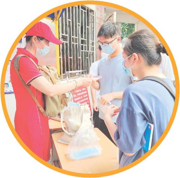 十七中考点外,带队老师给考生发准考证。 记者唐霁云 摄