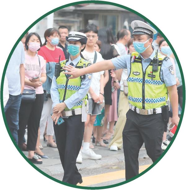 7日在中山中学考点,交警在维持交通秩序。记者李凯 摄