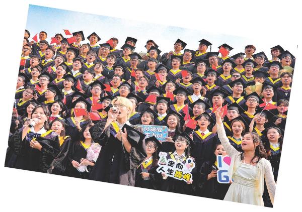 桂林理工大学的毕业生在拍摄合影时一起高歌。