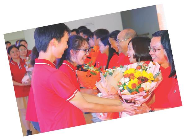 桂林中学高三毕业班的学生给老师献上鲜花,表达他们的感恩之情。