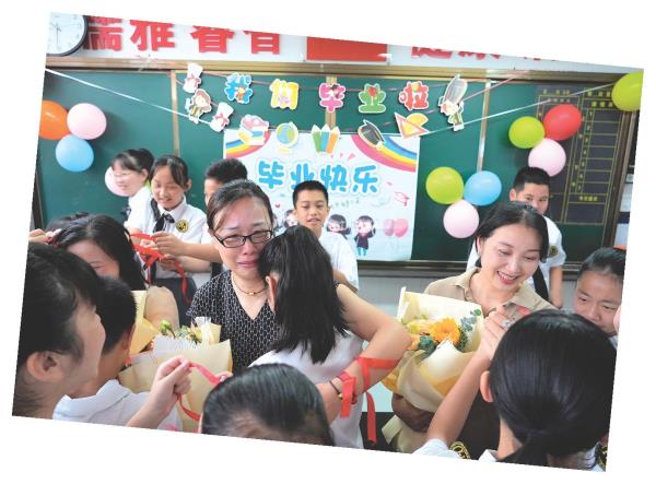 民主小学六年级的毕业生和老师拥抱。 记者滕嘉 摄