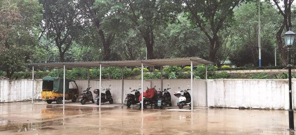 ↑工人疗养院小区建了停车棚。记者刘净伶 摄