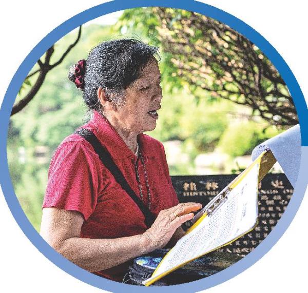 一位音乐爱好者在榕湖边跟着曲谱练歌。