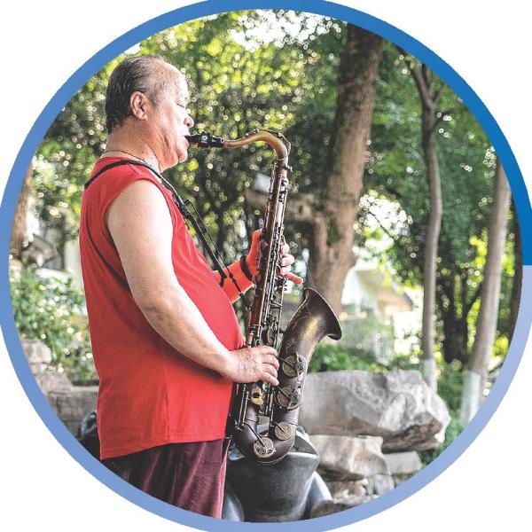 一位市民在榕湖边吹萨克斯。