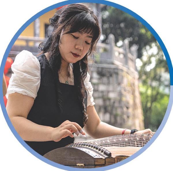 一位市民在古南门前弹奏古筝。